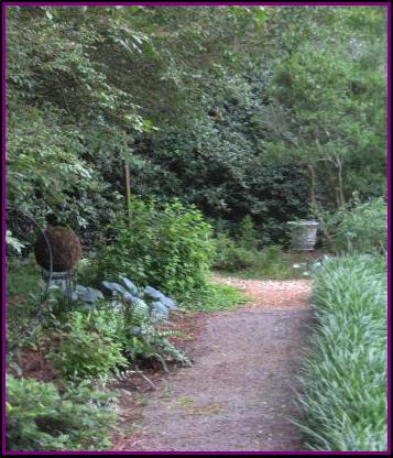 To the left is a path through another shaded area in the garden...Blue-foliage hostas can be seen by the moss ball. |