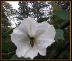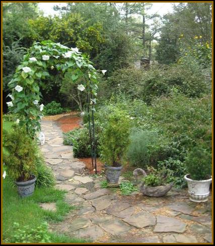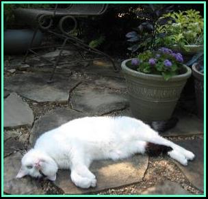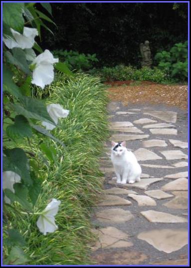 Laurie plants a moonvine on an arch every year; she starts them from seed. Above is the MOONVINE arch in 2011. AT RIGHT are two shots of the sphinx moth that visited Laurie’s moonvine every day for a week that year! Laurie was a big entomology buff as a child, so she was thrilled to see him come back night after night...and he showed before it even got dark! Below is the flagstone patio that is just to the left before the arch above. And Wordworth the cat showing off. |