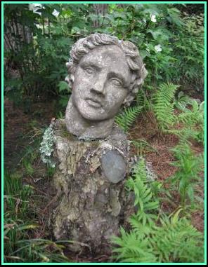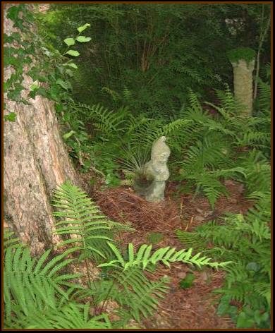 Above is the ”foyer“ of The Spiral Corner. Laurie found the gnome thrown out on the side of the road in a neighbor’s trash; now he greets visitors entering this fern-abundant corner! That is, unless they enter through the althea arch from the other direction; in that case, they are greeted by the little sylvan fellow on the tree stump below. He has ivy growing from his head. Hard not to take a lichen to him. |