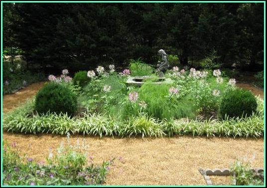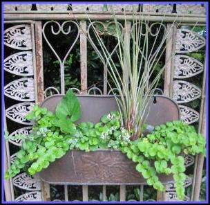 Above is a small planter made from an old mailbox. It contains “diamond frost” euphorbia, a bromeliad, a wild violet, and creeping jenny . It is hanging on a metal screen (seen behind the fountain in the photo just left). Below is the homemade fountain as seen from the back patio when the self-sown cleome are blooming... |