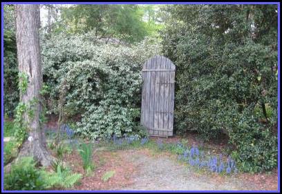 Below is a view of the “secret garden door” when the ajuga is blooming. Between it and the river birch on the left is the arch that enters into ”The Spiral Corner.“