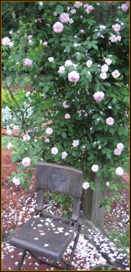 The little chair covered in rose petals seen on the left was a plastic chair a neighbor had thrown out. Parker rescued it, painted it and made the applique on the top. Laurie isn’t a dumpster diver—she just likes to repurpose stuff other people discard! |