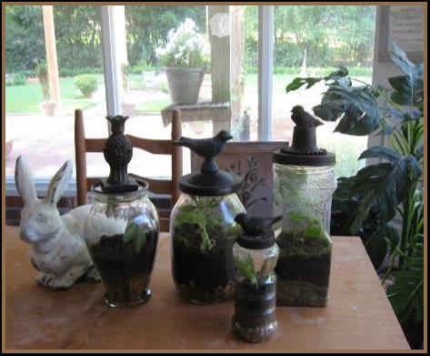 Laurie likes to take cuttings, and has found that terrariums provide an environment that helps them root more readily. No surprise she also makes her own terrariums (seen at right)—using large jars and making ordinary plastic lids more decorative by attaching cheap figurines and giving the whole lid a faux metal finish. She especially favors using birds for the tops. |