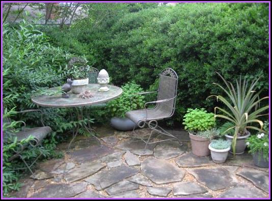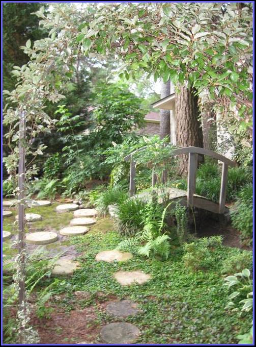 Below, seen through yet another arch she made—by connecting the arching branches of eleagnus to a metal T-bar, you can see her charming little garden bridge. She designed the bridge (to go over one of the ditches she dug to try to redirect the ”river“) and Buck Swain, her cousin, built it for her in 2012. But she had to do something right away to give it an ”aged“ look, so she did a wash with gray and green paints. Since then, the elements have aged it naturally. This ”room“ is enclosed by spirea, an Arizona cypress, nandina, and elderberry. She has started a moss garden here (between the round stepping stones arranged in a spiral). She calls this shady area ”The Spiral Corner.“ |