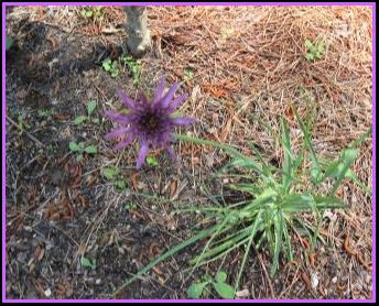 Rosemary rooted from sprigs, candytuft and white alyssum are seen in the circle planter above. The fountain is solar. The turtle is a mosaic turtle, a gift from friends just before the release of Parker’s book The Turtle Saver in 2001. Below—Parker has salsify in her garden, a ”gourmet“ vegetable that taste like oysters! The blooms are pretty, too! (It’s a biennial she grows from directly-sown seed.) |