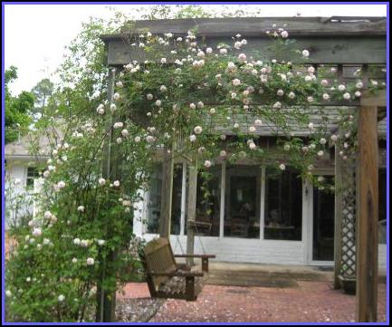 Above and left are views of the roses growing on the pergola which covers the patio. She planted them as two 6-inch cuttings in 2012; photo above is from 2014.