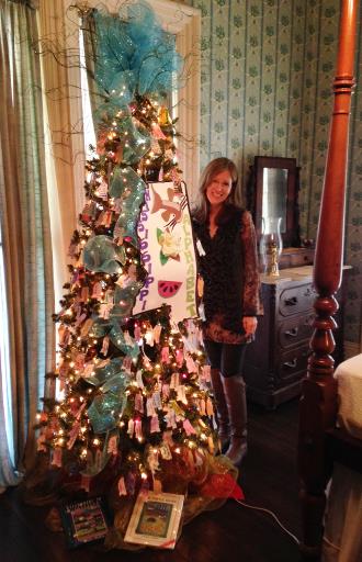November 2015: The “LAURIE PARKER TREE” at Merrehope in Meridian, Mississippi. Their annual Festival of Trees had a literary theme in 2015. Other trees in the historic home were decorated to honor Donna Tartt, John Grisham, and Eudora Welty. |